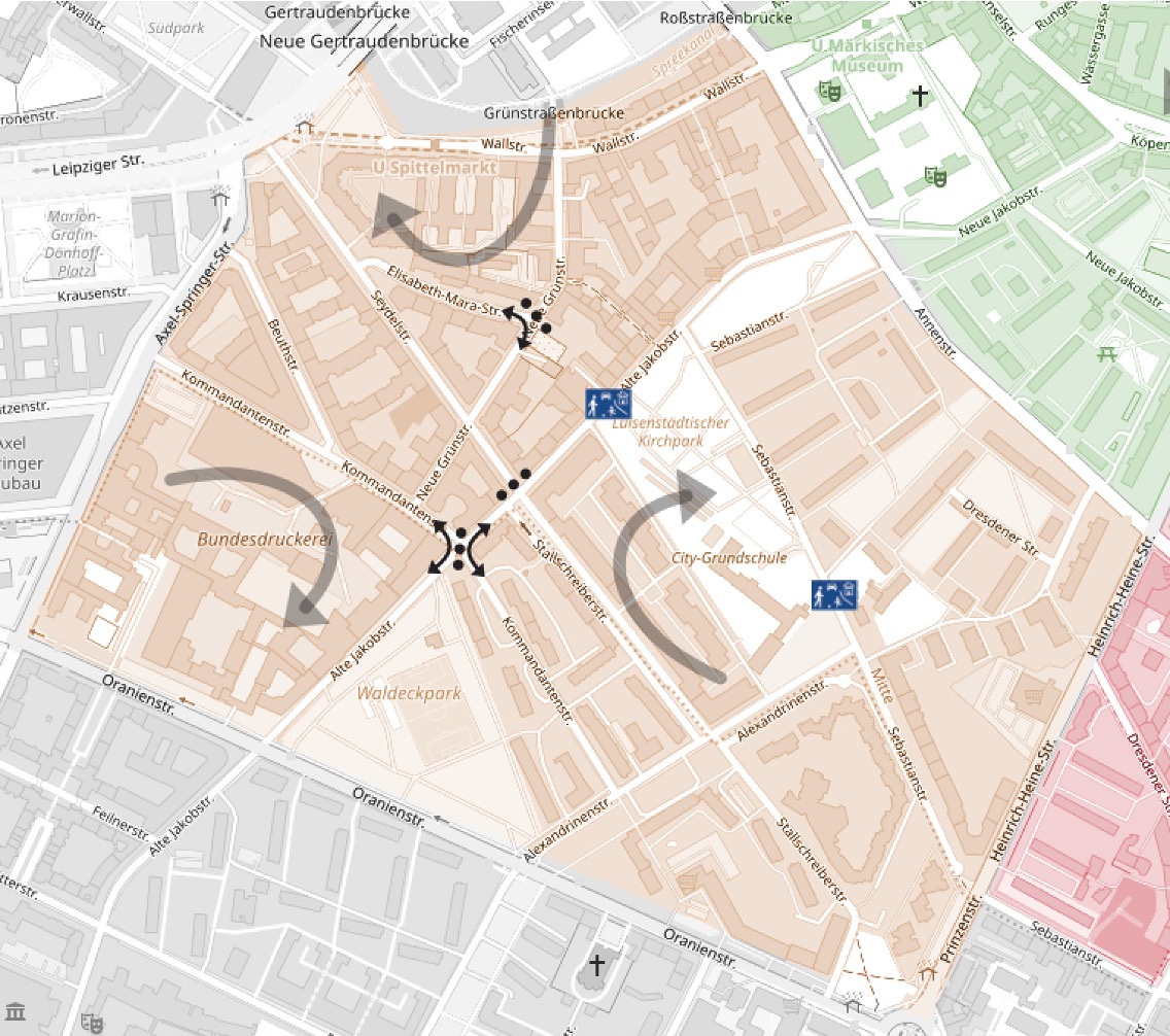 Ziel: Durchgangsverkehr entlang Seydelstr. (von Spittelmarkt über Alte-Jakobstr. nach Annenstr.) verhindern