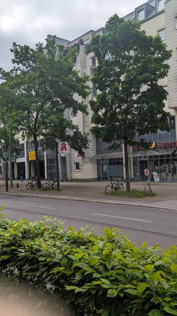 Vor dem Netto-Supermarkt gibt es nur einen privat aufgestellten Felgenkiller, der nichts taugt und zu wenig für die Kundschaft ist. Um Umfeld sind weitere Geschäfte (z.B. Apotheke, Arztpraxen). Der Gehweg bietet genügend Platz, allerdings ist hier der "Radweg" so grottig, dass man hier nur schlecht als Radfahrer fahren kann.