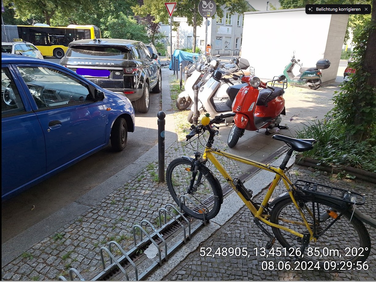 In der Ecke ist Restaurant, Späti, Friseur, andere Geschäfte, und ein Wildwuchs von Leihrädern, Uralt-Felgenbiegern und vielen geduldeten Zweirädern auf dem Gehweg und keine ordentlichen Fahrrad Abstellmöglichkeiten. In der Plesser Straße ist laut SenMVKU-Kartierung Parkfläche für 86 Kfz, da findet sich schon Platz. Die paar Meter zur Karl-Kunger-Straße sind auch eng & unübersichtlich durch das enge (legale) Parken.