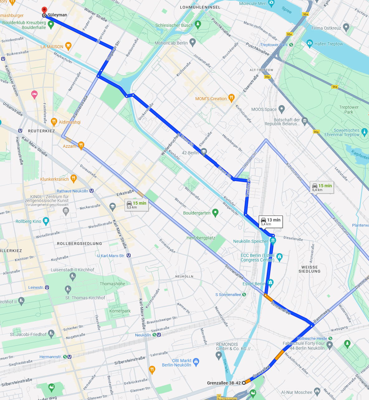 Ich habe oft beobachtet, dass der Kiez für folgende Route als Umfahrung genutzt wird: Von der Grenzallee kommend, statt auf der Sonnenallee zu bleiben wird auf die Ziegrastraße abgebogen und dann das Kiehlufer entlang oder über die Teupitzer Str. in die Harzer Straße gefahren. Von da geht es dann zum Beispiel nach Neukölln oder Kreuzberg.