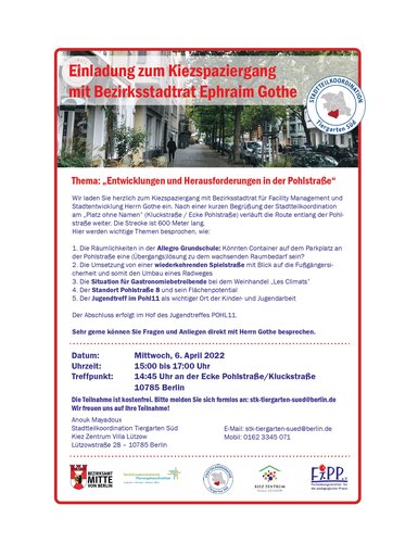 Am 06.04.2022 von 15:00 Uhr bis 17:00 Uhr findet der Kiezspaziergang statt - welche Ideen haben Sie?