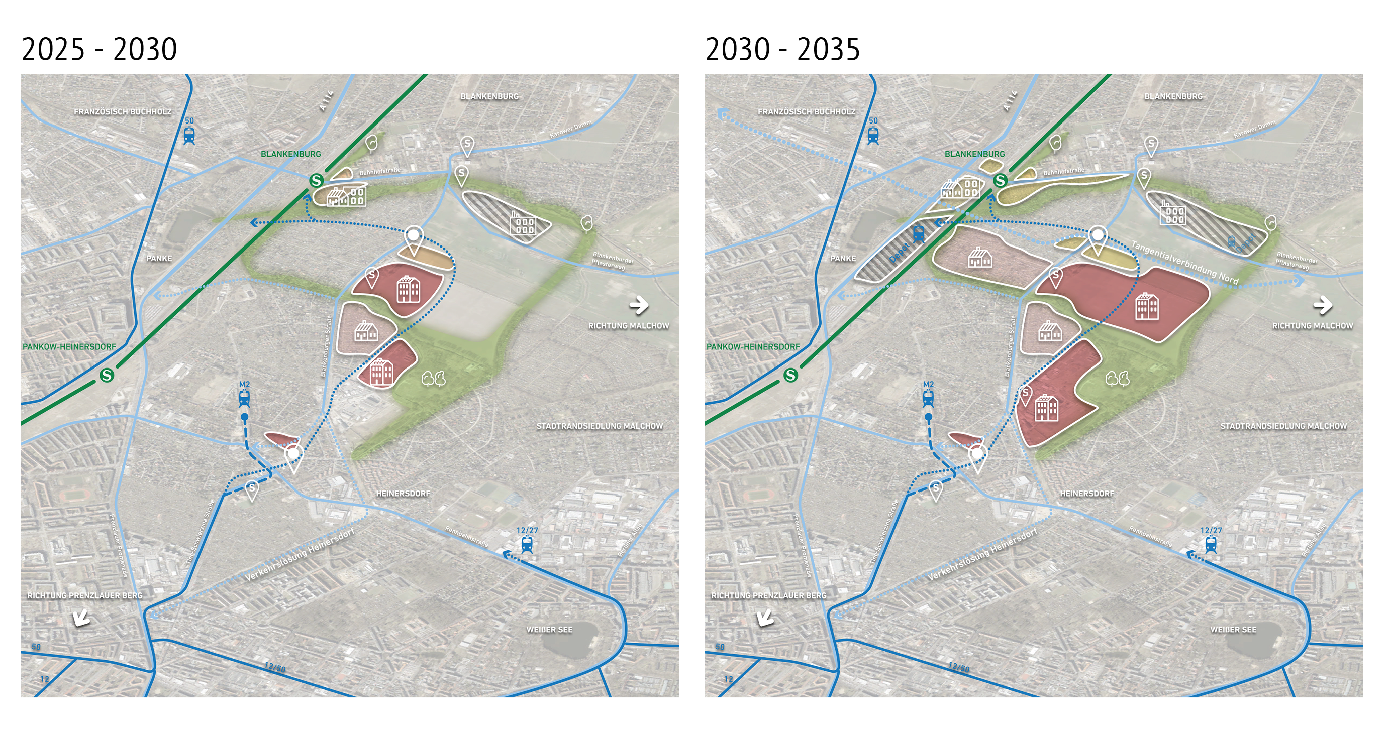 Die Verlängerung der Tram M2 und die Verkehrslösung Heinersdorf werden in der Phase I realisiert. Diese sollen fertiggestellt sein, wenn die ersten Wohnungen auf der derzeit landwirtschaftlich genutzten Kernfläche bezugsfertig sind. Eine genauere Planung wird noch erforderlich.
