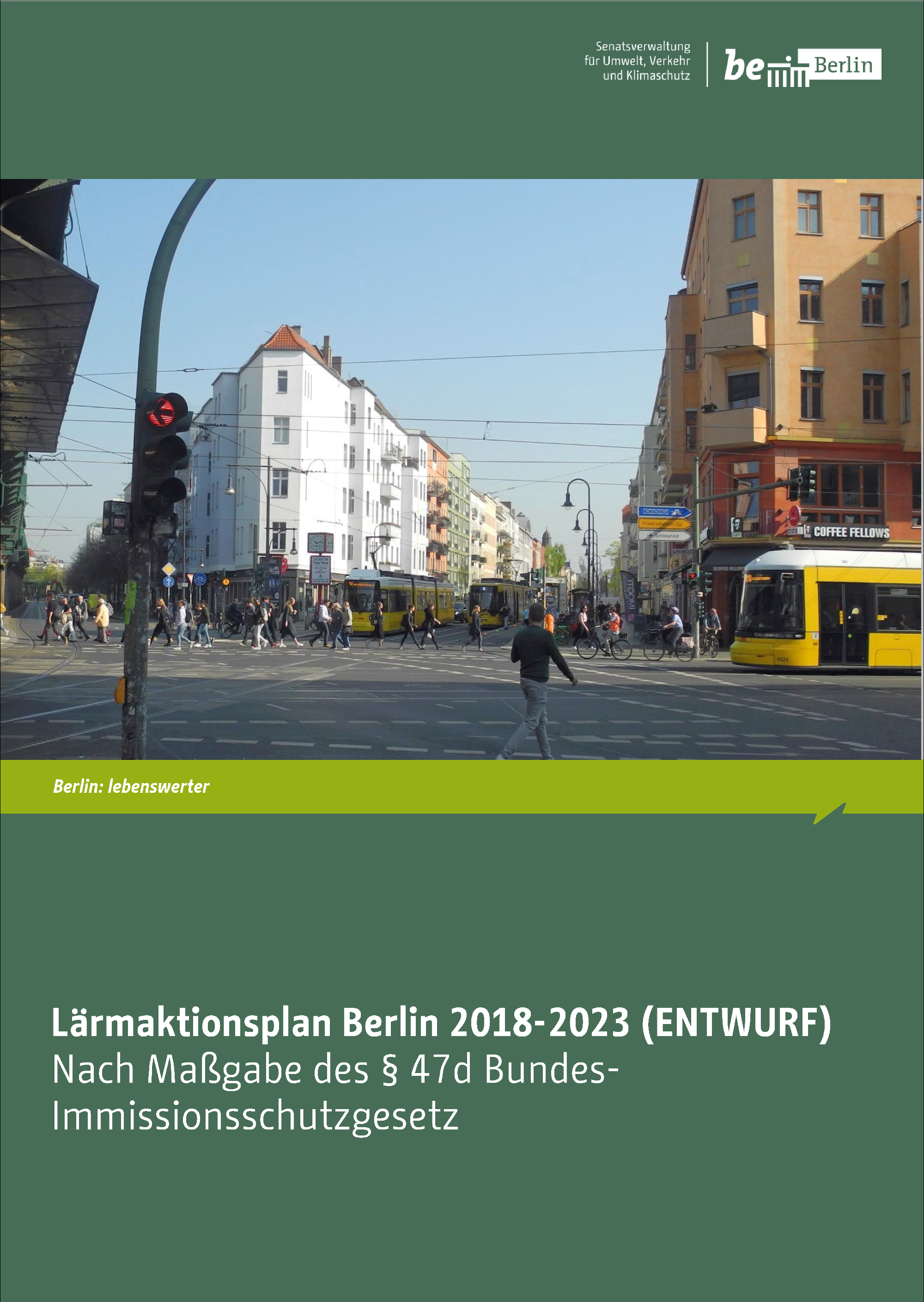Mit dem Entwurf des Lärmaktionsplan Berlin 2018-2023 wird über die Mitwirkung der Öffentlichkeit im Rahmen des Online Dialogs „Berlin wird leiser 2018“ berichtet und es werden Vorschläge für Maßnahmestrategien zur Reduzierung der Verkehrslärmbelastungen im Ballungsraum Berlin für die Zeit bis 2023 vorgestellt.