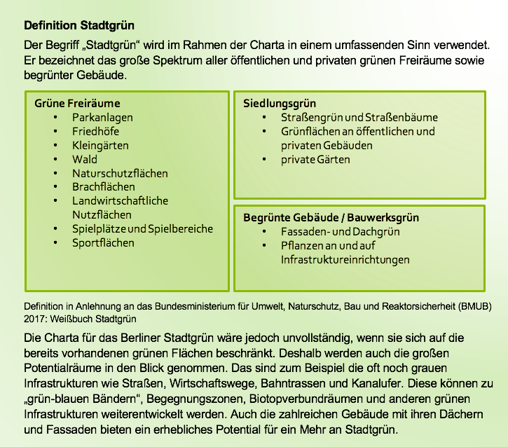 Mit einer Charta für das Berliner Stadtgrün sollen Leitlinien, Strategien und Maßnahmen für eine grüne und nachhaltige Entwicklung Berlins entstehen. Die Charta wird in den Jahren 2018 und 2019 in einem breit angelegten Dialog erarbeitet. Mit der Vorlage dieses Impulspapiers eröffnet die Senatsverwaltung für Umwelt, Verkehr und Klimaschutz die Diskussion um die Inhalte der Charta, zu der alle eingeladen sind.