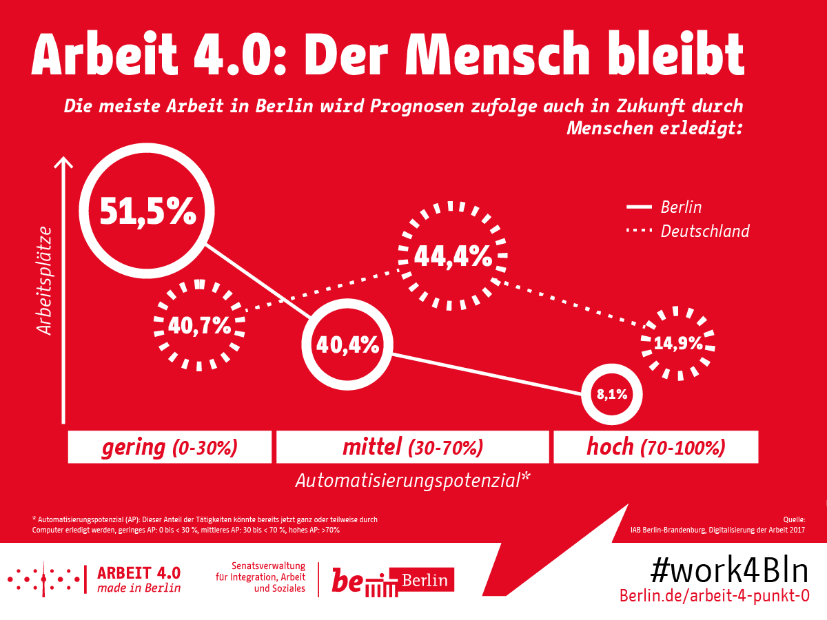 Das Automatisierungspotenzial liegt in Berlin damit deutlich niedriger als im Rest der Bundesrepublik. Ein wichtiger Grund dafür liegt in der Struktur der Berliner Wirtschaft: Annähernd neun von zehn Beschäftigten sind in einem Dienstleistungsberuf tätig. Dort hat Technik überwiegend unterstützende, nicht aber eine ersetzende Funktion.