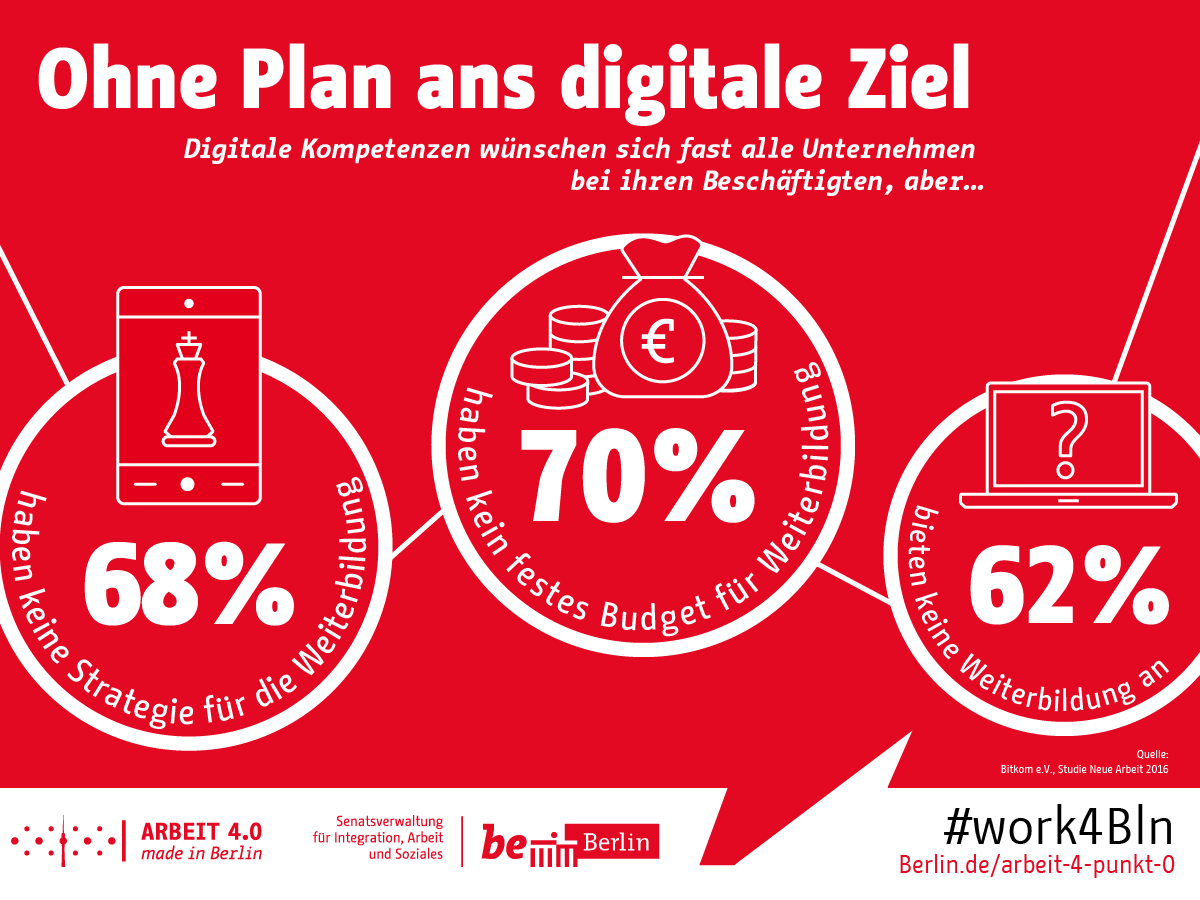 Digitale Kompetenzen werden dann so wichtig sein wie fachliche und soziale Fähigkeiten. Davon zeigten sich neun von zehn befragten Unternehmen überzeugt. Allerdings: Sie selbst haben bislang nur wenige Ansätze entwickelt, die benötigten Kompetenzen am Arbeitsplatz zu vermitteln und zu trainieren. Mehr als zwei Drittel der Unternehmen gaben an, weder eine Strategie noch ein festes Budget für die Weiterbildung ihrer Beschäftigten zu haben.