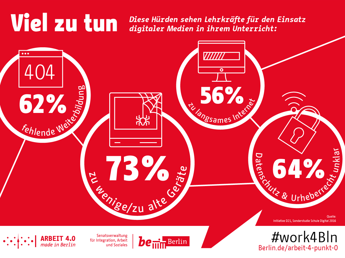 Die Initiative D21 schließt daraus: Ein Computerraum allein macht noch keine digitale Bildung – es mangelt an der Anwendung. Zusätzlich erforderlich seien didaktische Konzepte, welche die verfügbaren Endgeräte systematisch in den Unterricht einbeziehen. Die Lehrerinnen und Lehrer selbst begründen ihre Unsicherheit so: Häufig seien Internet oder Technik zu alt und zu unzuverlässig. Zudem fühlen sich die Lehrkräfte häufig unsicher in Bezug auf Datenschutz oder Urheberrechte und wünschen sich mehr Weiterbildung.