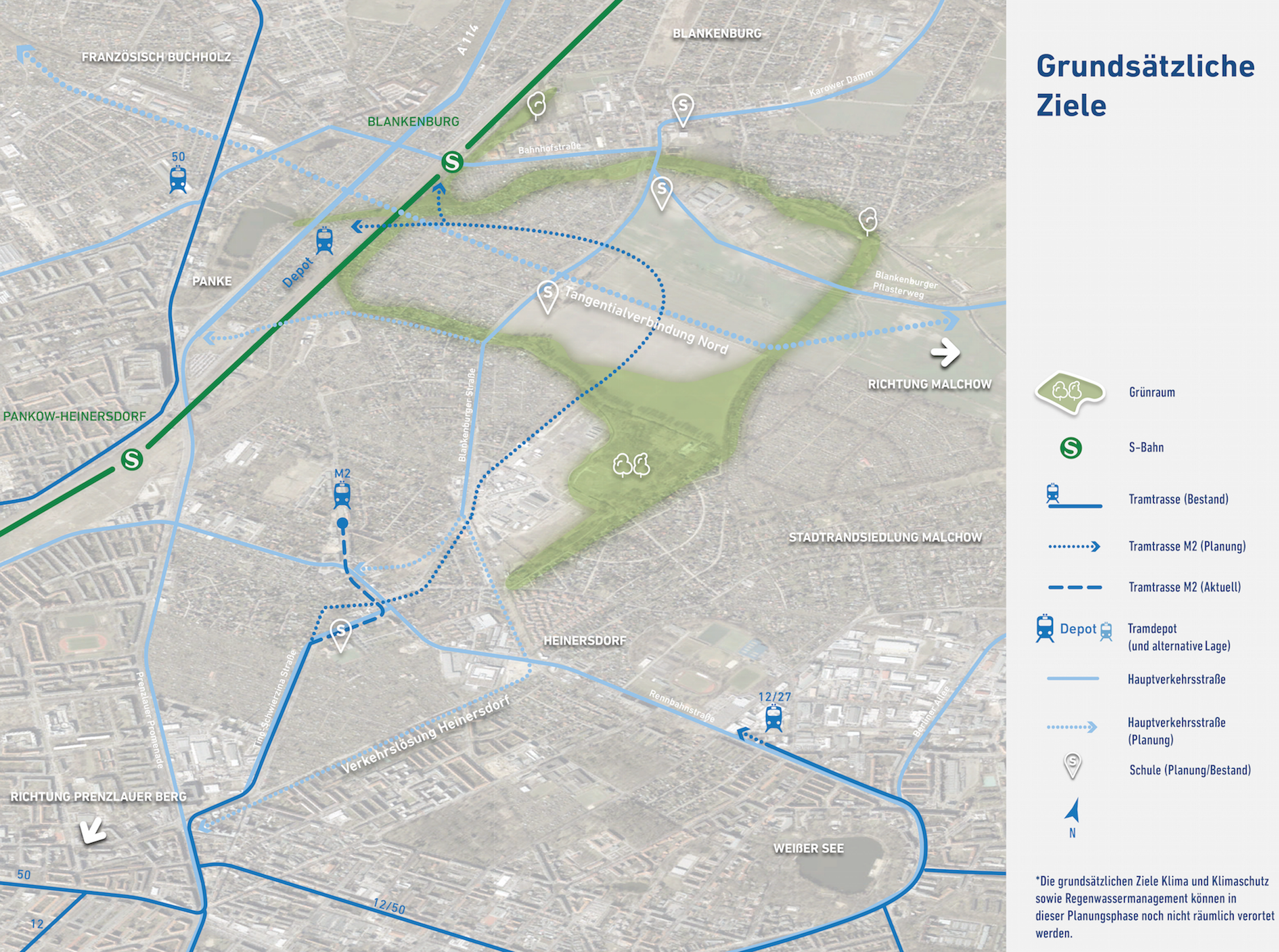 Die Tram M2 wird dabei voraussichtlich über den Ortskern Heinersdorf Richtung Norden verlängert – durch das heutige Gewerbegebiet Heinersdorf, über die derzeit landwirtschaftlich genutzte Kernfläche bis hin zum S-Bahnhof Blankenburg.