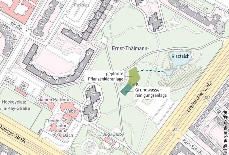 Im Zusammenhang mit den Planungen zur Qualifizierung des Parks und Maßnahmen der Klimaanpassung im Stadtumbaugebiet Prenzlauer Berg entstand die Idee, nicht das gesamte gereinigte Wasser in den Boden rückzuführen, sondern für weitere Zwecke, wie bspw. die Speisung des Kiezteiches oder zur Parkbewässerung zu nutzen. Dafür bedarf es jedoch einer Aufbereitung des noch im gereinigten Wasser befindlichen Ammoniums.