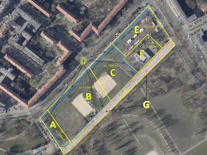 Erarbeitung eines Gesamtkonzeptes für die langfristige Gestaltung und Nutzung der Gesamtfläche sowie für eine stufenweise Gestaltung bzw. Umsetzung von Nutzungen auf den Teilflächen (A Denkmalort, B Schuldrehscheibe, C Baustelleneinrichtung/Grünfläche/Bürgerwiese, D verkehrliche Erschließung) incl. einer Betrachtung und Vertiefung von Teilbereichen.